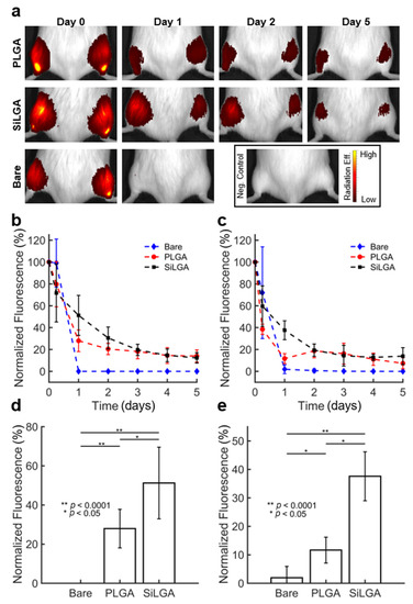 Silica slows burst release kinetics of BSA after intramuscular injection in mice: (a) Radiation efficiency of BSA-Cy7 PLGA NPs (top), BSA-Cy7 SiLGA NPs (middle), and unencapsulated BSA-Cy7 (bottom) in the hind legs of immunocompetent mice (B6a) as imaged over a five-day span; saline was injected into the negative control shown at Day 0. Normalized fluorescence levels of intramuscular BSA-Cy7 over a five-day span in (b) B6a and (c) NSG mice. Error bars represent one standard deviation above and below the mean normalized fluorescence level, calculated across six injection sites. (d) Normalized fluorescence levels of unencapsulated (“Bare”) PLGA, and SiLGA formulations of BSA-Cy7 after one day in (d) B6a and (e) NSG mice.