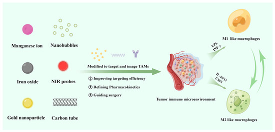 Different imaging technologies have different requirements for TAM-targeting approaches. MRI and PET/CT nanoprobes usually have relatively stable imaging capabilities at the atomic and inorganic compound levels. More attention should be given to the biological safety exploration of MRI/PET nanoprobes, especially in the aspects of internal deposition and radioactive safety [104]. Currently, researchers have partially achieved the abovementioned goals through preparation forms or targeting methods such as PEG modification and macrophage-targeted ligand modification.