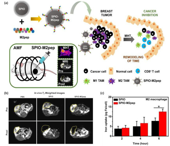 (a) Schematic of the preparation of SPIO-M2pep and the mechanism of SPIO-M2pep in M2 TAM-targeted and MRI-guided magnetic hyperthermia therapy of breast cancer. (b) MR imaging of orthotopic breast tumor mice before and 30 min after injection of SPIO or SPIO-M2pep (tumor: yellow dashed line) (c) Iron uptake in M2 macrophage cells treated with SPIO and SPIO-M2pep for different incubation times (25 μg mL−1, n = 3). p values less than 0.05 are considered significant and marked with * [19]. Copyright 2021, Elsevier.