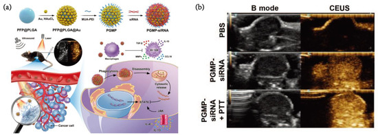 (a) Schematic illustration of the preparation and antitumor strategy of PGMP-siRNA NPs. (b) In vivo CEUS imaging and B mode of nanoprobes [32]. Copyright 2022, Springer Nature.