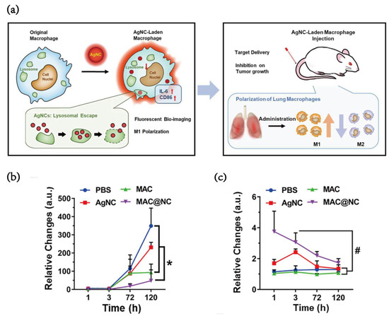 Silver nanoparticles (AgNPs) have been increasingly used in pharmaceuticals and medicine due to their unique chemical, physical and biological intrinsic properties [34]. Recently, Yan et al. [35] reported a novel type of AgNCs with super fluorescence stability after being devoured by macrophages for 48 h. AgNCs, with excitation and emission wavelengths of approximately 500 and 700 nm, respectively, were taken up by macrophages and then triggered the proinflammatory responses of macrophages by the activation of Toll-like receptor 4 (TLR4). Because of the lysosomal escape effect, AgNC obtains stable and permanent fluorescence in vivo. This result demonstrated that 24 μg of AgNCs was taken up by 2.0 × 106 macrophages, which means that approximately 1.2 × 10−5 μg of AgNCs was taken up by a single macrophage. Displaying an effective targeting tendency toward metastatic tumors, AgNCs markedly inhibited tumor growth and modulated the tumor immune microenvironment. Moreover, Pal et al. [36] reported that AgNC-induced oxidative stress modulates TAMs from an M2 to an M1 phenotype (Figure 5a). Moreover, macrophages containing AgNCs formed after coculturing with AgNCs had a significant inhibitory effect on the lung metastasis of tumor cells (Figure 5b). The red fluorescence signal from MAC@CN could be observed in the lung 120 h after treatment (Figure 5c).