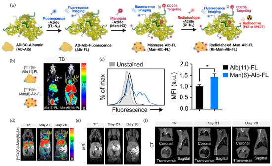 Serving as a powerful tool in clinical and preclinical research because of its high sensitivity and total body penetrance, PET is a molecular imaging technology based on radionuclides [43]. Exhibiting beneficial imaging faculty in atherosclerosis [44], neurodegenerative tauopathies [45], different types of tumors and chronic inflammation [46], PET also showed great potential in targeting TAMs and examining the portrayal of tumor boundaries [47]. TAM-targeting PET nanoprobes are typically constructed by a radionuclide-labeled molecule and a TAM-targeting vehicle. Some receptors mainly expressed by TAMs, such as the colony-stimulating factor 1 receptor (CSF-1R), CD206, scavenger receptors, chemokine (C–C motif) ligand 2 (CCL2), glucan receptor, folate receptors and arginase, usually become the targets of TAM-targeting PET nanoprobes [48]. As a novel imaging nanoprobe with a certain amount of mannose to maximize TAM-targeting ability, Man(6)-Alb is serum albumin containing six mannose molecules created by the click reaction (Figure 6a) [49]. The evidence confirmed that the mannose quantity was derived from the pharmacokinetics of nanoprobes in a healthy mouse model. With six mannose molecule modifications, Man(6)-Alb is regarded as the optimum mannosylated serum albumin (MSA) accumulating in lung metastasis of breast cancer because of its long elimination half-life as unmodified albumin and similar liver uptake as Man(8)-Alb. Capturing images after 19 h (the elimination half-life of Man(6)-Alb) minimizes the impact of signals from the blood pool. More importantly, the similar liver levels between Man(6)-Alb and normal Alb indicate that Man(6)-Alb could instruct metastatic lung lesions of tumor tissue due to the targeting macrophage modification (Figure 6b). The half-life and liver uptake level of Man(6)-Alb enabled it to be competent for the imaging task of lung tumor metastasis. Additionally, in vivo experiments revealed that Man(6)-Alb aggregated around the secondary lesion site. The uptake of the probe by CD206+ macrophages was analyzed by flow cytometry. The signal of Man(6)-Alb was approximately 1.4 times that of nonmodified probes (Figure 6c). This article also discusses the application of multimodality imaging, which successfully describes the lung metastasis progression of 4T1 and LLC tumor-bearing mice and obverses tiny metastatic lesions that could not be identified in MRI or CT imaging at 21 days after the operation (Figure 6d–f). Extensive in vivo imaging studies using single photon emission computed tomography (SPECT) and positron emission tomography (PET) have shown that the blood circulation of time-optimized MSA can be used to identify metastatic lesions, and there is a strong correlation between its signal and pulmonary metastasis load.