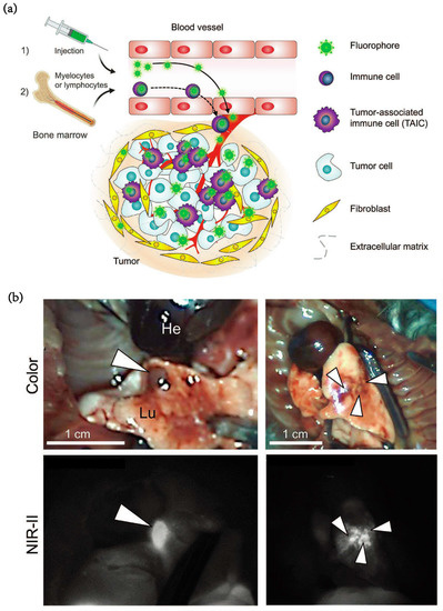 - Kang, H.; Shamim, M.; Yin, X.; Adluru, E.; Fukuda, T.; Yokomizo, S.; Chang, H.; Park, S.H.; Cui, Y.; Moy, A.J.; et al. Tumor-Associated Immune-Cell-Mediated Tumor-Targeting Mechanism with NIR-II Fluorescence Imaging. Adv. Mater. 2022, 34, 2106500. [Google Scholar] [CrossRef]
