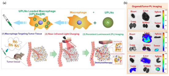 (a) Schematic diagram indicating applications of near-infrared (NIR) excitation upconverting persistent luminescent nanoparticles (UPLNs)-loading macrophages for real-time tracking of tumor therapeutic macrophages in vivo after endocytosing these nanophosphors in vitro and following macrophage biodistribution by simple whole animal optical detection. (b) After tail vein injection for 24 h, the distribution of persistent luminescence nanophosphors in excised organs and tumors for different treatment groups [96]. Reprinted (adapted) with permission from [96]. Copyright 2018, American Chemical Society.