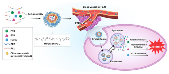 In this study, we used pH-sensitive mPEG-pH-PCL copolymer micelles as carriers for the controlled drug release and delivery of anti-cancer drugs (Figure 1). In addition, we assessed the combination index (CI) of PTX, ETP, and RAPA and investigated the in vitro cytotoxicity, in vitro pH-sensitivity assessment, in vitro release profiles, and pharmacokinetic profiles of micelles.