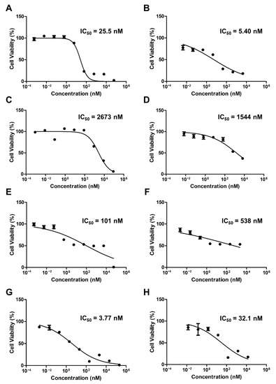 In vitro cytotoxicity analysis of AGS-Luc2 cells after 48 h of treatment with (A) free PTX, (B) PTX-loaded mPEG-pH-PCL micelles, (C) free ETP, (D) ETP-loaded mPEG-pH-PCL micelles, (E) free RAPA, (F) RAPA-loaded mPEG-pH-PCL micelles, (G) free PTX/ETP/RAPA, and (H) PTX/ETP/RAPA-loaded mPEG-pH-PCL micelles (n = 18).