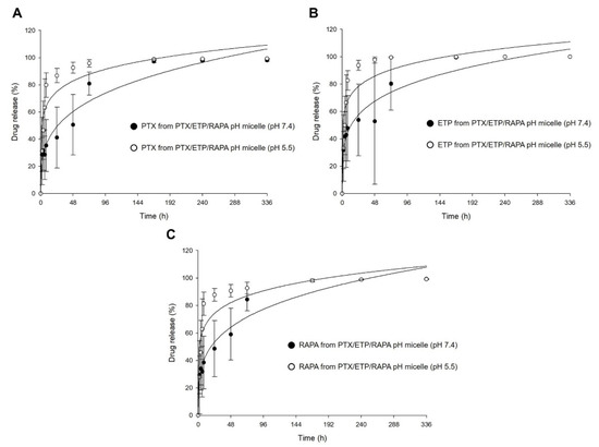 The drug release of micelles encapsulated with PTX/ETP/RAPA was investigated using the dialysis method [52,53]. Briefly, PTX/ETP/RAPA-loaded mPEG-pH-PCL micelles were put in a dialysis membrane (MWCO = 20 kDa) and stirred in 2 L of PBS (pH 7.4 and 5.5) at 37 °C and 200 rpm. The pH of PBS (pH 7.4 and 5.5) was measured with a pH meter (Mettler Toledo, Columbus, OH, USA), and the pH values were titrated by 0.1 N HCI. At predetermined sampling times (0, 2, 4, 6, 8, 24, 48, 72, 168, 240, and 336 h), 20 µL of a sample was taken and diluted 10-fold with ACN. The concentrations of PTX, ETP, and RAPA were determined by HPLC. At 8, 24, 72, 168, and 240 h, fresh medium was substituted for the PBS (pH 7.4 and 5.5) release medium. Data were evaluated using the Peppas model of SigmaPlot v. 10.0 (Systat Software, Inc., San Jose, CA, USA).