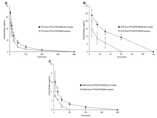 Figure 6 and Table 4 show the plasma concentration–time profiles and pharmacokinetic parameters of the PTX/ETP/RAPA-loaded mPEG-pH-PCL micelles and the PTX/ETP/RAPA solution. In Figure 6A, the plasma concentrations of PTX were detected at up to 240 min, both in the micelles and in the solution. Those of ETP were detected at up to 60 min in the micelles and at up to 30 min in the solution (Figure 6B). Finally, the plasma concentrations of RAPA were detected at up to 120 min in the micelles and at up to 30 min in the solution (Figure 6C). All three drugs were not found at concentrations below the limit of detection (LOD). In Table 4, the PTX area-under-the-curve (AUC) value of the PTX/ETP/RAPA-loaded mPEG-pH-PCL micelles was 1.6-fold higher in the micelles than in the solution. The AUC value of ETP was 3.0-fold higher in the micelles than in the solution (p < 0.05), and that of RAPA was 2.4-fold higher in the micelles than in the solution (p < 0.05). Overall, the micelle formulation showed higher AUC values and lower total clearance (CLt) and volume of distribution (Vd) values than the solution.