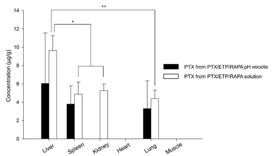 Biodistribution of PTX in PTX/ETP/RAPA-loaded mPEG-pH-PCL micelles and PTX/ETP/RAPA solution in each tissue at 8 h after intravenous injection (* p < 0.05, ** p < 0.01) (n = 3).