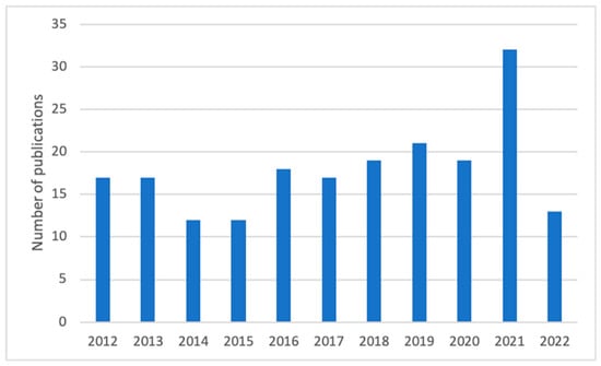 The search performed in the Web of Science Core Collection, PubMed and Scopus (June 2022) led to a total of 197 publications (review, research article, short communications and proceedings paper). All identified articles were pooled to reference manager software (Mendeley) in order to remove duplicates and select relevant papers. After reading the abstract, or in some cases the full text, publications dealing with soil science, ecology, plant pathology and cell culture were excluded, as well as articles about other Vaccinium species and Vaccinium myrtillus fruits. Following this selection, 64 publications remained, and the distribution over the 10 years is represented in Figure 1. Some of these publications (six research articles) reported the pharmacological action or bioactive compounds of polyherbal formulations/plant mixtures [7,8,9,10], and Ieri et al. reports results for the analysis of the bud extract of bilberry [11].