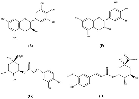 Chlorogenic acid, also known as 3-O-Caffeoylquinic acid, is the ester of caffeic acid and quinic acid, and along with feruloylquinic acid, it is the dominant phenolic acid in VM leaves [18,29,30]. According to Tian et al., the main phenolic compounds found in the analyzed samples collected from Finland were Caffeoylquinic acids, with 3-O-Caffeoylquinic acid being the dominant compound [31].