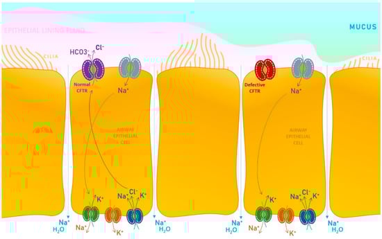 In a healthy state, the physiologic water content of the airway surface liquid is maintained by a subsequent mechanism facilitated by the absorption of sodium (Na+) ions through a dedicated channel (epithelial Na+ channel), exiting the cell by the basolateral Na+-K+ pump. Chloride ions enter the cell by the basolateral Na+-K+-2Cl− cotransporter and are excreted mainly through the CFTR protein present at the surface of the apical membrane level, which functions as a chloride channel. Secondary, there are also calcium-activated Cl− channels that may partially depurate the chloride from the cell. Considering all the trafficking mechanisms presented, the CFTR physiologic expression and functioning is critical for all other channels that assure a normal electrolytic exchange and a regulatory pathway in the context of secretory tissues (Figure 1).