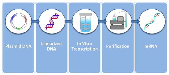 Following the IVT reaction, the resulting mRNA must be purified in order to remove contaminants and receive pharmaceutical-grade mRNA. Purification procedures widely employed are chromatographic procedures such as Ion Exchange, Affinity Poly(dT) and ion-pair reverse-phase chromatography [73]. These chromatographic techniques are usually paired with tangential flow diafiltration steps [74]. Figure 3 summarizes the events up to the production of pure mRNA. The product is then ready to be forwarded to the next step, which is the incorporation in the delivery vector of choice that constitutes the vehicle for cellular delivery.