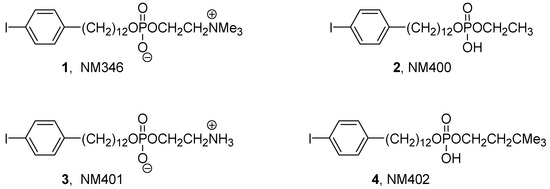 - Meyer, K.L.; Schwendner, S.W.; Counsell, R.E. Potential tumor or organ-imaging agents. 30. Radioiodinated phospholipid ethers. J. Med. Chem. 1989, 32, 2142–2147. [Google Scholar] [CrossRef]