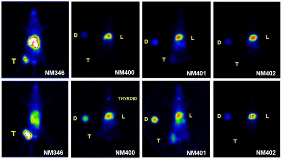 At the end of the 120 h gamma camera scanning protocol, the animals were euthanized and subjected to tissue distribution analyses. Biodistribution results are summarized in Table 1. NM346 (1) had the highest levels of radioactivity in the blood, duodenum, lung and tumor. Tumor levels of radioactivity after administration of NM346 were 2.04 ± 0.18% ID/g as compared with NM401 (3) which had a 0.36 ± 0.08% ID/g in the tumor. NM400 and NM401 had very low tumor radioactivity levels (<0.1% ID/g). Although NM402 did not accumulate in the tumor, it displayed the highest levels radioactivity in the liver (3.3 ± 0.5% ID/g, 25.3 ± 2.5% dose/organ). NM400 (1.3 ± 0.07% ID/g, 15.4 ± 1.0% dose/organ) and NM402 (1.14 ± 0.17% ID/g, 10.7 ± 0.8% dose/organ) had much lower levels of activity in the liver. NM346 possessed liver levels of radioactivity (0.84 ± 0.12% ID/g, 11.79 ± 1.5% dose/organ) similar to those of NM401.