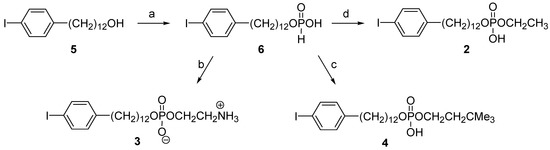 - Kley, J.T.; Unger, C.; Massing, U. Synthesis of isosteric phosphono analogs of biologically active alkylphosphocholines. Monatsh. Chem. 1998, 129, 173–185, (3-(trimethylammonio)propylphosphonate analogs). [Google Scholar] [CrossRef]