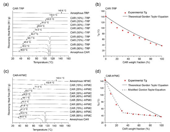 mDSC thermograms (reversing heat flow) of (a) co-amorphous CAR-TRP and (c) CAR- HPMC systems. The experimental Tgs are indicated by arrows. (b) Comparison of experimental and theoretical Tg values of co-amorphous (b) CAR-TRP and (d) CAR- HPMC systems.