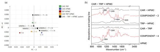 PCA score plot of FTIR spectra of CAR − TRP + HPMC, PC-2 was plotted against PC-4 (a). Loading plot of PC-2 and PC-4. Reference FTIR spectra of CAR-HPMC, TRP-HPMC, CAR-TRP binary amorphous systems and HPMC (b).