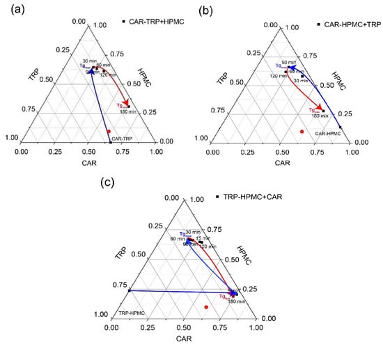 Ternary phase diagrams of CAR − TRP + HPMC (a), CAR − HPMC + TRP (b) and TRP − HPMC + CAR (c) A-B+C amorphous systems. The arrows indicate the change in the composition ratio of the saturated amorphous A − B + C ternary phase during the rise and fall of the Tg values upon milling. The positions of the maximum and minimum of the Tgs in each ternary phase diagram are marked by Tg max and Tg min. The theoretical composition without phase separaion is indicated with a red dot (CAR:TRP:HPMC = 60.5%:30.4%:9.1%).