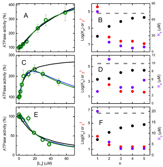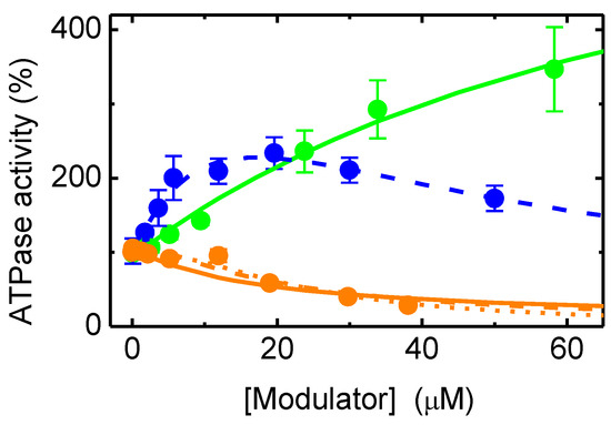 The results were first analyzed with the usual equation considering the total concentration of modulator and both activation and inhibition of ATPase activity by the modulators [45,46], see Supplementary Information (Equation (S1)). The results were then analyzed with the formalism derived in this manuscript considering the distribution of the modulator in the distinct environments (aqueous phase, lipid bilayer and P-gp) and several equal and independent binding sites in P-gp’s binding pocket, Equations (3)–(9). The best fit was obtained with nonlinear least-square analysis using Microsoft Excel [47].