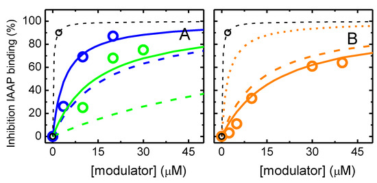 Inhibition of IAAP binding by NBD–C4 (◯) and NBD–C8 (◯), plot A, and by NBD–LysoMPE (◯), plot B. The results obtained with Tariquidar are also shown (◯). The continuous lines correspond to the best fits of Equation (S2), which considers competitive inhibition. The dashed lines are the prediction from the highest affinity obtained in the ATPase assay, with the constraint (long dash) or no constraint (short dash).