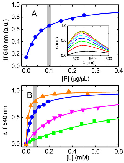 In Figure 3A, the fluorescence intensity from NBD–C8 is represented as a function of the total concentration of protein in the native membranes. In plot B, the quantity of the membranes is expressed as the concentration of phospholipids, considering the mass ratio of phospholipids to proteins (0.57 w/w) and the average phospholipid molar mass of 750 g/mol obtained for these membranes [39].