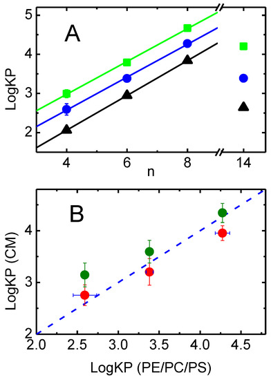 The relation between the partition coefficients obtained for simple bilayers prepared from POPC, and to lipid bilayers representative of the native membranes, is shown in Figure 4A. The value of LogD (Table 1) is also shown, which is an estimate of the amphiphile hydrophobicity, as evaluated from the partition between the aqueous media and octanol.