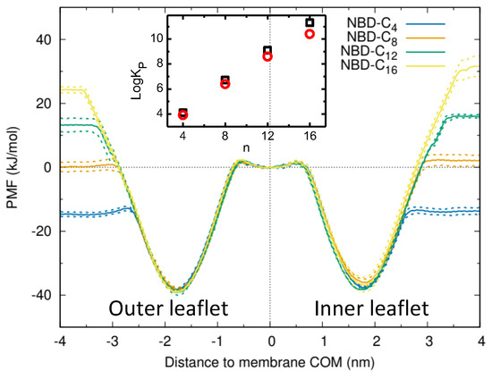 The PMF profiles for the transfer of the NBD–Cn amphiphiles from water to the complex asymmetric membrane (without P–gp) are shown in Figure 5. To allow a continuity in the PMF for the asymmetric system, the membrane COM was considered for the energy reference.