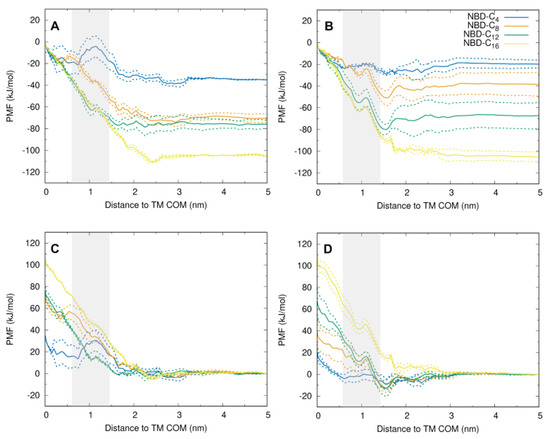 The PMF profiles for the transfer of the NBD–Cn from their equilibrium position in the lipid bilayer towards P–gp were obtained for the simple (POPC only) and for the complex asymmetric membrane using the radial distance between the COM of the amphiphile polar NBD group and that of the P–gp TM region as reaction coordinate. The PMFs are shown in Figure 6, and their convergence is shown in the Supplementary Information, Figure S11.