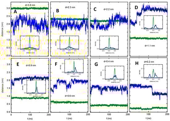 Transverse location of the NBD group of NBD–C4 (z, —) and radial distance to the TM COM of P–gp (d, —) as a function of the simulation time in the windows corresponding to a restrained distance to the TM COM of P–gp (d = 3 nm (A), in the lipid bilayer; d = 2.2 and 2.3 nm (B,C), approaching the P–gp outer surface; d = 1.1 nm and 0.9 nm (D,E), near P–gp’s entry gate; and d = 0.6, 0.4 and 0.2 nm (F,G,H), inside the P–gp binding pocket). The insets show the density of the NBD group around its average position in each window relative to the transverse (z, —) and to the constrained radial (d, —) distance.