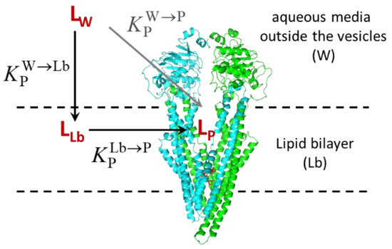 The native membranes of High-Five insect cells expressing mP–gp (1.0 mg/mL) were incubated at room temperature with the indicated concentrations of the inhibitor for 5 min. IAAP (5 to 7 nM) was later added, and the reaction mixture was further incubated for 5 min under subdued light. The samples were photocross-linked with 366 nm UV light for 10 min at room temperature, followed by electrophoresis and quantification, as described previously [48]. The raw data are shown in the Supplementary Information (Figure S4). The results were first analyzed with the usual equation, considering the total concentration of IAAP and NBD amphiphile, as well as competitive inhibition of IAAP binding, see Supplementary Information (Equation (S2)). The dissociation constant considered for IAAP was taken from the literature, 412 nM [15]. The results were also analyzed with a formalism derived in this manuscript considering the distribution of the NBD amphiphile in the distinct environments (aqueous phase, lipid bilayer, and P–gp), the distribution of IAAP between the aqueous media and P–gp, and several equal and independent binding sites in P–gp’s binding pocket, Equation (10).