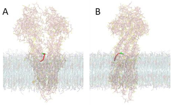 An atomistic configuration of the P–gp (PDB code 4M1M), with a reconstructed linker region, was converted to CG using martinize.py. The protonation states of histidine residues were defined in accordance with O’Mara and Mark [53], namely, the double protonation of His149, His583, and His1228. The protein structural conformation was maintained using the ElNeDyn22 elastic network [54] with a force constant KSPRING of 500 kJ mol−1 nm−2 and a RC cut-off of 0.9 nm. The assembling of the surrounding membrane and solvation with water, Na+, and Cl− beads in a 150 mM concentration was performed using insane.py, creating a lipid bilayer with the selected lipids in a random distribution. Both the martinize.py and insane.py scripts were obtained from the Martini webpage (http://cgmartini.nl, accessed on 26 October 2022). A snapshot of the complex membrane system containing one P–gp molecule is shown in the Supplementary Information (Figure S6).