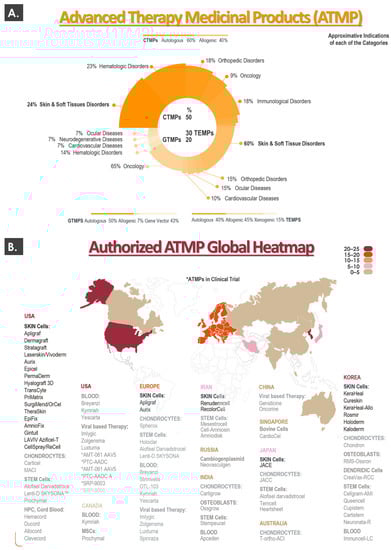 To set the appropriate general context for the present work, a summarized global overview of currently approved cell and gene therapy products was prepared, with an emphasis on cytotherapies for cutaneous application. A condensed worldwide overview of the currently approved advanced therapy medicinal products (ATMP), distributed into product sub-categories and classified by therapeutic indication, is presented in Figure 1A [6]. A worldwide list of the currently authorized ATMPs, along with an illustration of the geographical distribution (i.e., heatmap) of product approvals, is presented in Figure 1B [6,8,10].