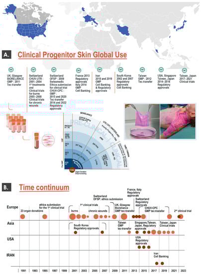As previously mentioned, a restricted number of countries or regions (e.g., USA, Europe, Iran, South-East Asia) have historically been implicated in the development and clinical use of cytotherapies for cutaneous application (Figure 1B). Aside from initial reports on the clinical topical use of dermal progenitor fibroblasts and derivatives in Lausanne dating back to the 1990s, many of the protocols and products currently under investigation have been developed in alternative burn centers (e.g., in Nantes, France or in Tehran, Iran) in the past 20 years (Figure 2) [10,17,18].