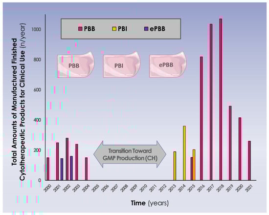 At the time of the initial clinical work set forth under the Swiss progenitor cell transplantation program (i.e., starting in 1991), the relevant regulatory jurisdiction was mainly cantonal (i.e., ethics commissions, cantonal chemists), assorted to centralized program registration with federal health authorities [17]. Later, major and disruptive updates took place in 2007, with the instauration of renewed regulations which trickled down from European practices, as well as the entry into effect of new Swiss laws [19]. These proceedings yielded a direct impact on local clinical work, due to the necessity to adapt material bioprocessing schemes and cytotherapy manufacture to GMP standards (Figure 3, Table 3). Historically administered as magistral preparations under hospital exemptions or compassionate use, PBBs are currently considered as standardized transplant products under Swiss laws or as combined advanced therapy medicinal products (cATMP), entailing specific manufacturing requirements and registration pathways [16,19].