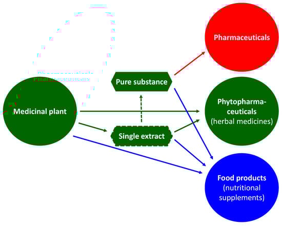 Medicinal plants and their importance in medicinal therapy are characterized among the lay public as medicinal tea and preparations derived from it, mostly as dragee, tablet, or juice. In fact, the spectrum of their use is much wider. While medicinal teas use the entire dried part of a medicinal plant, extractions can be used to focus on the relevant groups of constituents. Subsequently, there is the possibility of purification to obtain a pure substance, which is combined with the option for a final partial synthesis to arrive at the desired molecular structure. Examples include steroid hormones, corticoids, cardiac glycosides, artemisinin, and taxol. There is great interest in pure substances of natural origin, for example, substances with (supporting) antiviral effects or saponins (e.g., QS21 soap bark tree extract) as excipients for mRNA-based active ingredients [,]. Pharmaceuticals use these pure substances as active ingredients and functional agents, while phytopharmaceuticals (herbal medicines) contain plant parts or their extracts. Components of foods can be plant parts, extracts, or pure substances (Figure 1 and Figure 2) [,].