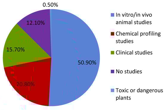 Figure 4 gives an overview of the status of studies on medicinal plants, which investigated extracts and thus multi-substance mixtures and not pure substances. More than 50 % (e.g., Echinacea purpurea (L.) MOENCH) of the studies are preclinical, the results of which determine whether studies on patients (approx. 15%) (e.g., Pelargonium radula (Cav.) L’HERIT) and studies on the clarification of the ingredients (20%) (e.g., Bovista plumbea Pers.) take place. Only in a few cases (0.5%) did the studies concern toxically relevant plants (e.g., Larrea mexicana MORIC.), while about 12% of the plants in the western market (e.g., Abrus precatorius L.) have no published scientific studies on their properties [].