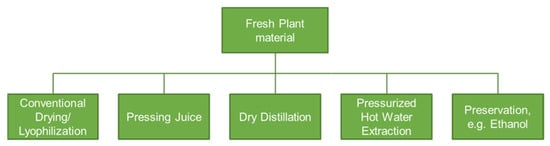 In Figure 6, additional optional processing options for freshly denatured plant material are presented, such as extraction with pressurized hot water or drying variants. In addition to conventional drying, lyophilization can also be useful for precious and sensitive ingredients, e.g., in flower constituents. Even today, fresh plant material should always be used for the production of mother tinctures for homeopathy.
