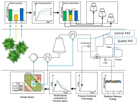 The work on future process technologies for the extraction of plant parts is characterized by the principle of rationality rather than empiricism. New extraction processes can be developed into efficient and robust productions using the techniques of quality by design (QbD) and process analytical technologies (PAT) in a goal-oriented manner []. In this context, Industry 4.0 and digitalization in the form of a digital twin have an essential role [,]. Industry 4.0 aims at more automated processes by making machines more autonomous, able to communicate with each other and analyze large amounts of data. To achieve maximum efficiency in this regard, technologies such as simulation and digital twins, machine learning, and artificial intelligence are being used. After a systematic analysis of existing processes, it is also possible to optimize them according to the goals for new processes. With regard to the regulatory requirements for the registration documentation of medicinal products, it is important that Module 3 “Quality” is in the foreground when QbD and PAT are used. However, the effects on the processing of questions in modules 4 (“Non clinical study reports”) and 5 (“Clinical study reports”), for example, with regard to test and trial medications, must also be taken into account [].
