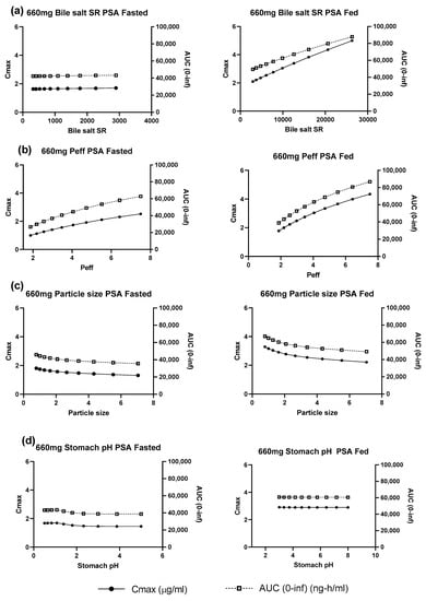 Parameter sensitivity analysis for 660 mg uncoated tablets under simulated fasted and fed states (a) bile salt solubilization ratio (b) permeability (c) particle size (d) stomach pH.