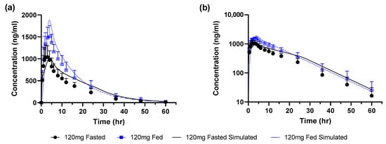 Observed (mean ± SEM) and simulated profiles for 120 mg granules (a) linear scale (b) log scale.