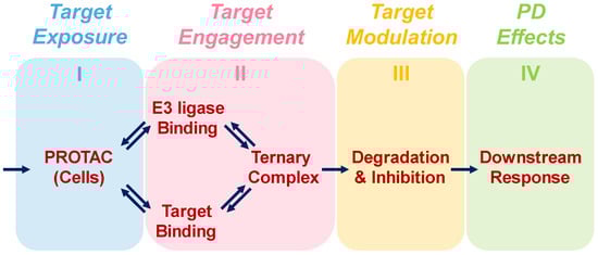 This framework provides practical guidance for project teams engaged in the quantitative assessment and rational optimization of PROTACs. We have used published and in-house experimental data to validate our models and to demonstrate their practical utility. Moreover, we only use parameters that are readily accessible to project teams. To ensure its translational value, our framework is built on the three pillars of clinical success concept which has become a hallmark of model-informed drug discovery and development (MID3) [9,10,11]. The concept was recently applied to PROTACs [12] and expanded to four pillars of translational pharmacology where successful drug action requires the drug to (I) be sufficiently exposed to its target(s), (II) engage its target(s), and (III) modulate the activity of its target(s), which in turn (IV) elicits the desired downstream pharmacodynamic effect(s) (see Figure 1). In the present article, we focus exclusively on pillars II–IV (PD) since, in the early phases of a project, assessment and optimization of compounds is based mainly on in vitro studies. For considerations on pillar I, i.e., the pharmacokinetics (PK) of PROTACs, please refer to recent publications by Pike et al. [13] and Cantrill et al. [14].