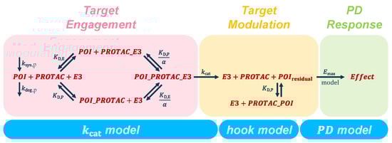 The pharmacodynamic modeling framework for PROTAC assessment and characterization consists of three models. (1) The model links the biochemical parameters which govern target engagement to target degradation. (2) The hook model relates target degradation to PROTAC concentrations and incubation time. (3) The model integrates two mechanisms of target modulation, i.e., target degradation and target inhibition, and translates them to a downstream pharmacodynamic readout.