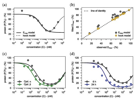 Already during the lead generation phase, it becomes necessary to analyze experimental data on PROTAC-mediated protein degradation with the help of mathematical models. Such models then allow to compare and rank different compounds with regard to their degradation parameters (e.g., and ). Currently, the PROTAC concentration-degradation relationship is most commonly described using the model [20]. However, that model has often failed to capture the loss of degradation observed at higher PROTAC concentrations, as in the case of the compounds from Zorba et al. [21]. The hook model, in contrast, fitted that data well (see Figure 3a, Figures S1 and S2). Notably, the two models agreed almost perfectly at the lower concentrations, illustrating that the hook model represents a valid extension of the model.
