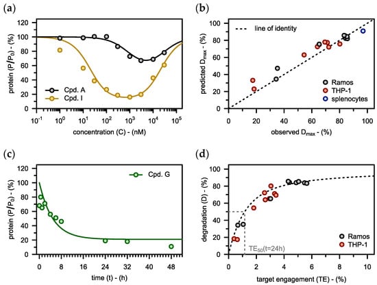 While predicting degradation represents the primary PK/PD modeling objective during lead optimization, target engagement () might be of mechanistic interest. Thus, we next calculated the maximum extent of achieved for the nine compounds in both cell lines (using Equation (3)) and related that value to (see points in Figure 4d). There was a clear quantitative relationship between target engagement and protein degradation (see Figure 4d), although the extent of target engagement remained low for all PROTACs achieving a maximum of just under 6% (). These results demonstrate that target occupancy is critical to the mechanism of action of PROTACs. The low , which may well be typical for PROTACs in general, might not be further increased by increasing PROTAC concentrations due to the hook effect. Since the extent of target engagement is low, it takes several sequential rounds of ternary complex formation and ubiquitination to get significant degradation. As a result, PROTAC-mediated degradation is a slow process (see Figure 4c) compared to target inhibition which operates at much higher target occupancies.