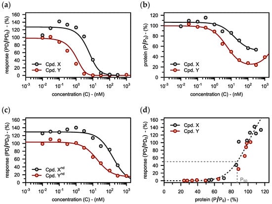 (a) The model is fitted to data on the downstream pharmacodynamic response (TNF-alpha levels) in the presence of various concentrations of the lead compound (Cpd. X). This analysis yields the target protein levels of half-maximal pharmacodynamic response () and an empirical hill coefficient (). Subsequently, a target profile is defined for a potential follow-up compound (Cpd. Y). (b) Target protein levels (RIPK2) are plotted against drug concentration. The model is used to predict the target concentration-degradation profile for the follow-up compound from before (Cpd. Y). (c) The downstream pharmacodynamic response (TNF-alpha levels) is plotted against the concentration of the corresponding non-degrading (nd) control compounds. (d) The observed TNF-alpha response is plotted against the corresponding RIPK2 levels for both compounds. The dashed line shows the fitted model from before, but this time explicitly neglecting inhibition (). Experimental data (a–d) taken from Mares et al. [23].