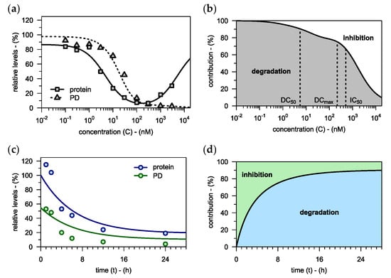 Furthermore, the contributions of degradation and inhibition to the overall pharmacodynamic response may also change over time. To showcase this effect, the time-course of degradation was predicted for an in-house PROTAC based on a literature value for protein half-life () [24] (see blue graph in Figure 6c). The PROTAC’s inhibitory potency, in turn, was informed using data on the corresponding non-degrading control compound (). Moreover, previous experiments had shown that there was no target-independent pharmacodynamic response (), no saturation of the pharmacodynamic response () and no empirical Hill coefficient (). From these inputs, the time-course of the pharmacodynamic response was predicted using the model (see green graph in Figure 6c). At the earlier time points, target inhibition was the dominant driver behind the downstream effect, while degradation only kicked in later (see Figure 6d). Note, that the contribution of inhibition to the overall effect was relatively strong because a high PROTAC concentration () was used.
