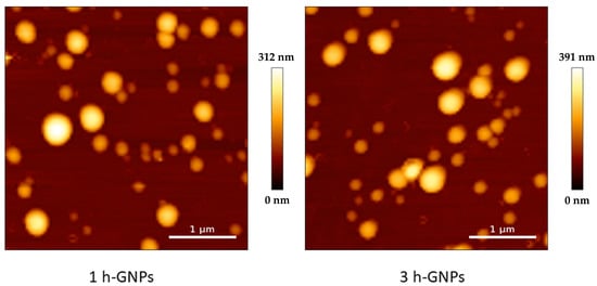For imaging GNPs by AFM, the QITM mode was used in liquid at a temperature of 37 °C. AFM images showed a spherical morphology of GNPs (Figure 2). The particle size of 1 h and 3 h crosslinked GNPs was determined to be 217 ± 52 and 224 ± 65 nm, respectively. The particle size and size distribution in AFM matches with the obtained ZetaSizer results also taking the different effects on sizes into account (hydrodynamic size for DLS and the tip-broadening introduced by AFM). In addition, the measurement at liquid conditions is avoiding the collapse of the particles reflected in the height scale and heights of the particles. Young’s moduli of all measured GNPs one day after preparation were around 4.12 and 9.8 MPa, respectively. At least 15 particles were analyzed for each batch. The difference was statistically significant (Figure 3). These values prove that increased crosslinking time led to an enhancement in the stiffness of GNPs as shown before []. This was exactly what was intended: to only change the elasticity of the carrier system without influencing other colloidal properties.