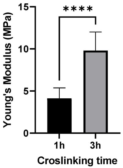 Young’s moduli for 150 kDa FITC-dextran-loaded GNPs produced with the two different crosslinking times applied in this study. Data is presented as the mean ± SD of three independently prepared batches, **** 3 h crosslinked particles are significantly different from 1 h crosslinked GNPs (p < 0.001).