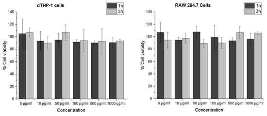 MTT assay was used to evaluate cytotoxic effects of GNPs on RAW 264.7 and dTHP-1 cells. RAW 264.7 cells were seeded in 96-well plates (Greiner Bio-one, Frickenhausen, Germany, 50 × 103 cells/well in a medium volume of 200 µL) and grown for 48 h to allow to reach confluence. THP-1 cells were seeded in 96-well plates (80 × 103 cells/well in 200 µL) supplemented with PMA (30 ng/mL) and cultured for 72 h to achieve differentiation. When confluence was achieved, cells were washed with HBSS and subsequently 150 kDa FITC–dextran-loaded GNPs in concentrations from 5 to 1000 µg/mL in HBSS were added to the cells and incubated for 24 h at 37 °C in 5% CO2-containing atmosphere. After the incubation time, particle suspensions were removed, and cells were washed with fresh HBSS. Cells were incubated with 10% MTT reagent (diluted in HBSS) for 4 h at 37 °C. The medium was discarded and 100 μL dimethyl sulfoxide (DMSO) was added. Subsequently, the plate was shaken and kept in the dark at room temperature for 15 min. Positive and negative control groups were treated with medium and 2% Triton-X, respectively. The absorbance was measured by using a microplate reader (TECAN infinite m200, Männedorf, Switzerland) at a wavelength of 550 nm [].